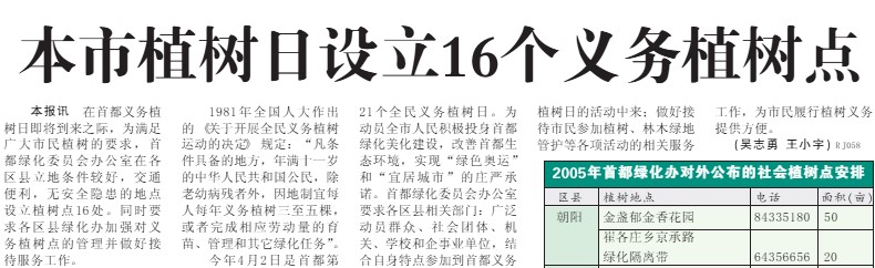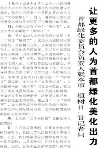 1985年,市人大八届四次会议通过市政府建议书,确定每年四月的第一个休息日为北京市人民“义务植树日”。北京成为全国第一个设立“义务植树日”的城市。(1985年3月21日《北京日报》1版,《让更多的人为首都绿化美化出力》)人们不禁好奇:已经有了植树节,为什么还要定个“首都全民义务植树日”呢?