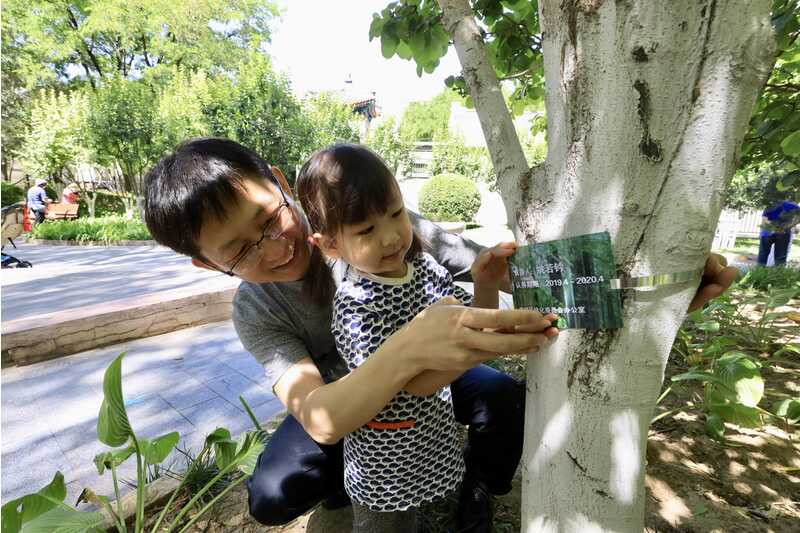 2019年,东四社区居民在奥林匹克公园为自己认养的树木挂上标牌。 饶强摄