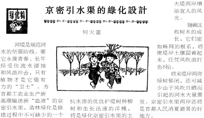 1966年4月5日,当这条全市最长的人工河道正式竣工通水时,那平展整齐的大堤上,笔直宽阔的公路旁,茁壮成长的树木已经成排成行,随风摇曳了。(1982年2月4日《北京日报》1版,《绿色长城 京密引水工程绿化成果纪实》)