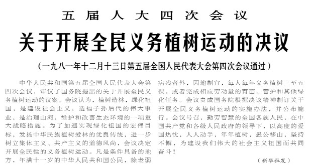1981年,五届人大四次会议通过《关于开展全民义务植树运动的决议》。这是国家最高权力机关第一次作出这样的决议,把义务植树作为一项法律确定下来。《决议》规定,凡是年满十一岁的中国公民,除老弱病残者外,每人每年义务植树三至五棵。(1981年12月16日《北京日报》1版,《关于开展全民义务植树运动的决议》)