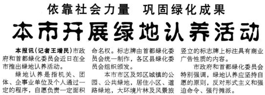爱绿、植绿、护绿,逐渐成为绝大多数北京人的自觉行动。1998年,本市推出绿地认养活动,首都市民成了绿地认养的主角。宣武区天宁寺北里小区居民、首汽集团职工陈广兴是城近郊区首位认养、认管绿地的个人,他认管小区楼间绿地1131平方米,一下就认管了30年。中小学生也以极大的热情投入到绿地认养、认管之中。大兴县4所学校的学生认养、认管4块街头绿地,面积达44000平方米。(1999年7月5日《北京日报》6版,《绿铺京华》)