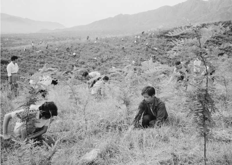 1983年,让荒山披上绿装的首都全民义务植树红旗单位——北京市科学技术委员会的人们,在雨后给树苗松土除草。 胡敦志摄